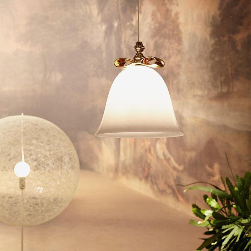 Introducing the Elsa, a charming blend of elegance and playfulness captured in a pendant light. Its delightful bell-shaped design with a whimsical gold ribbon adds a touch of sophistication to any space it graces.